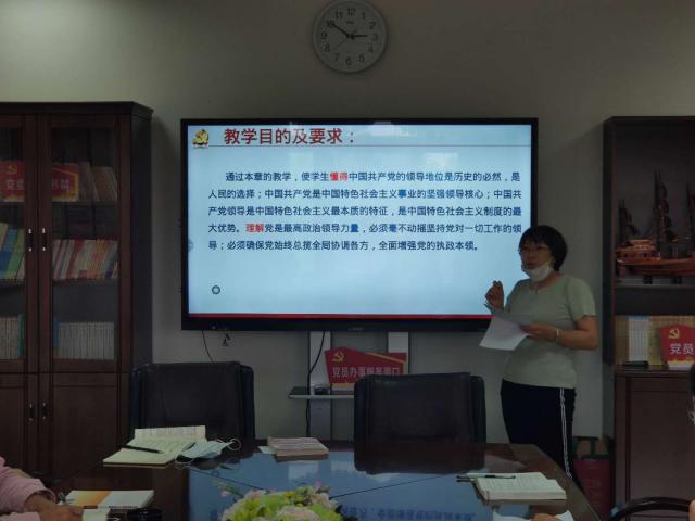 本次备课的内容是《毛泽东思想和中国特色社会主义理论概论》课程第十四章《坚持和加强党的领导》,由思政部李东老师牵头负责,她从章节的教学目标、教学方法、教学过程及所运用的教学资源等方面进行了详细阐述。