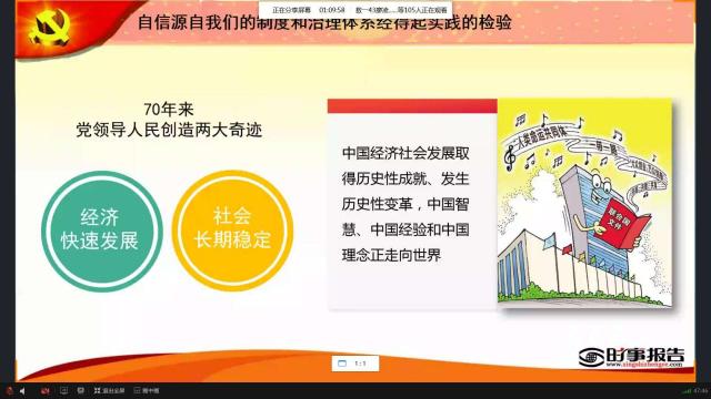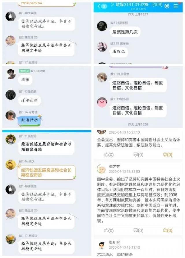 老师们通过讲解十九届四中全会的重大意义,全面分析了中国特色社会主义制度和国家治理体系的显著优势,系统解读了全会《决定》提出的总体要求、总体目标和重点任务,将“中国共产党为什么能、马克思主义为什么行、中国特色社会主义为什么好”等重大问题进行了重点阐述,打牢爱国主义思想基础。老师们克服疫情带来的不利影响,探索线上教学形式,综合运用多种教学平台,坚持理论联系实际,运用生动鲜活的案例、数据、图表,精准施策、因材施教,打造“线上”魅力思政课。