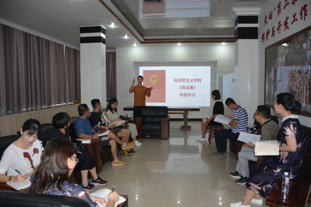 会上,胡啸尘老师领学《民法典》。胡啸尘紧紧围绕民法典的核心构件,从民法典的主要内容,民法与民法典的关系,民法典的历史由来以及民法典诞生的意义和地位,民法典的特殊性和世界贡献等几个方面进行了解读。他表示,作为思政课教师,要结合带头学好民法典,用好民法典,领会其中蕴含的法治精神和德治意识,上好思政课。
