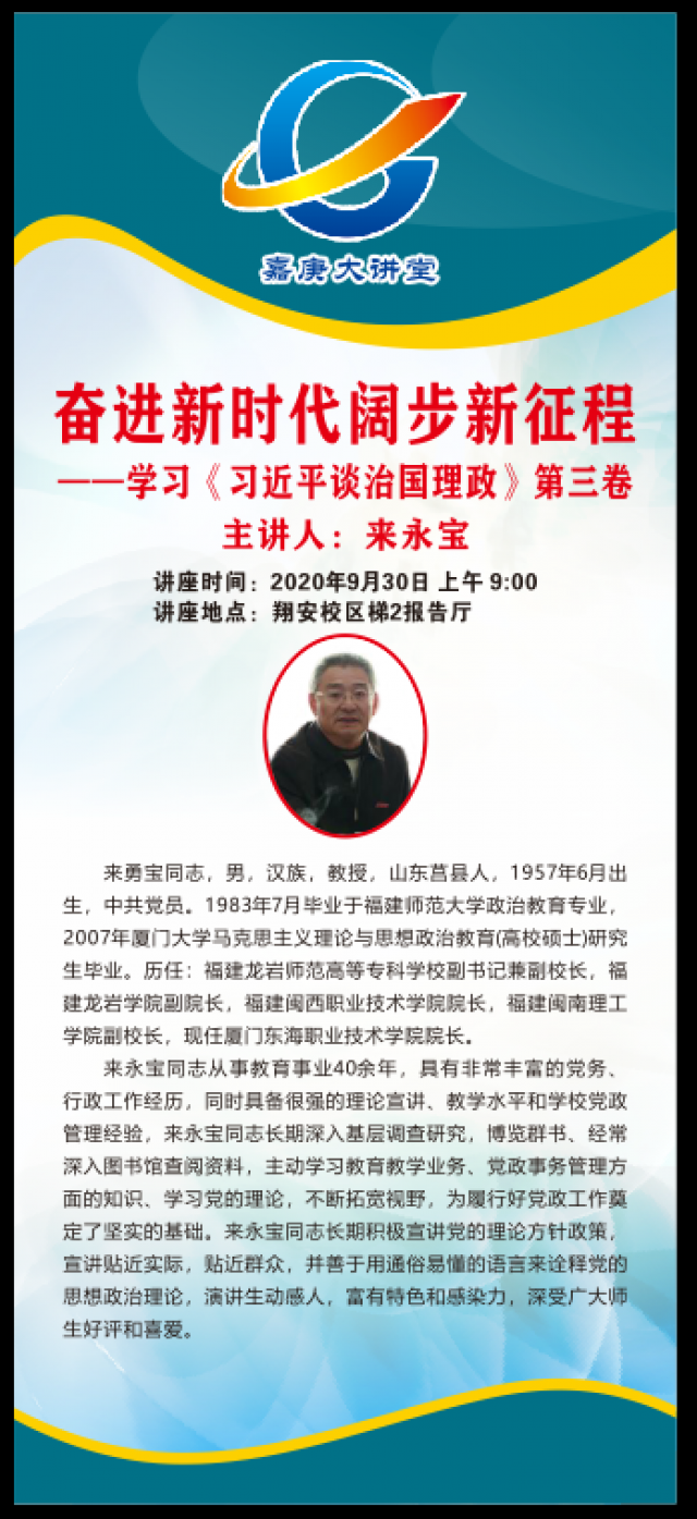 【讲座预告】嘉庚大讲堂:来永宝—奋进新时代阔步新征程一学习习总书记治国理政第三卷
