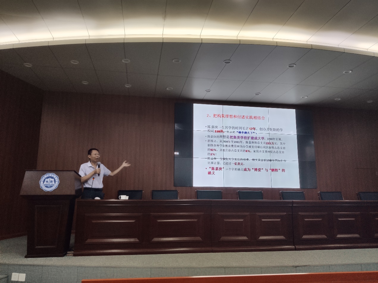 林教授简述了陈嘉庚先生一生的丰功伟绩。从少年时外出经商,初露锋芒;到后来在家乡兴办教育,创办了厦门大学等院校;抗日时期,积极捐款救亡,怒批汉奸汪精卫,并直言“敌未出国土前言和即汉奸”,一展嫉恶如仇的光辉形象。在政治问题上,陈嘉庚一直有着敏锐政治直觉,从他积极促进抗日统一战线的形成和后来分辨出国民党的腐败无能,意识到共产党才是中国的未来,并早早意识到“美国并无意维护世界和平”,这三点足见陈嘉庚先生政治才能之高超;晚年陈嘉庚,不顾家人反对孤身回国建设家乡,为家乡发展散发最后一分余热。继而得出,陈嘉庚是把个人梦和国家梦紧密结合,为祖国富强和民族振兴而奋斗一生的好榜样。
