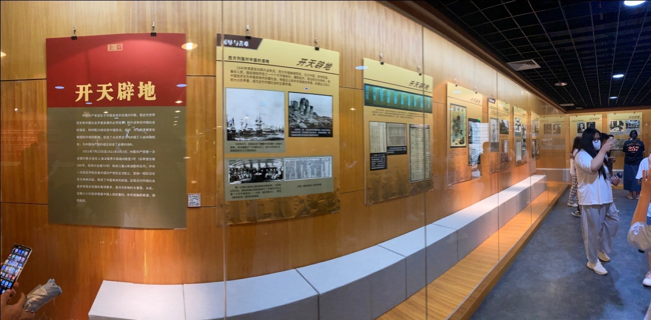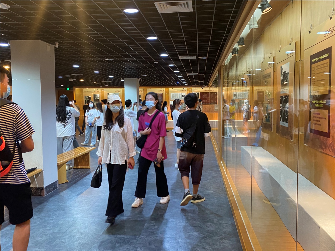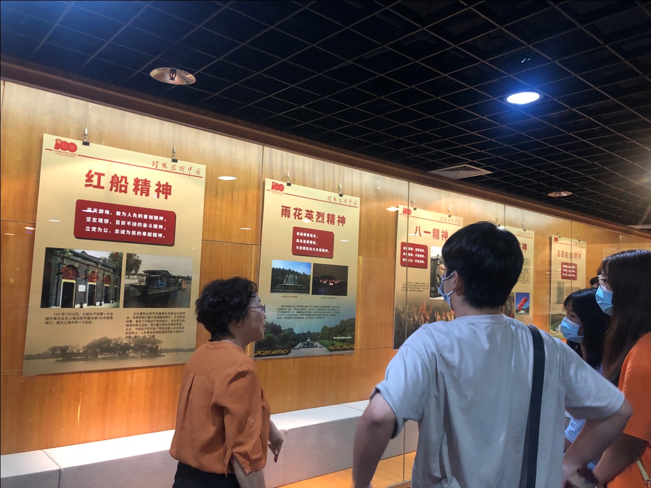 在华侨博物院《理想照耀中国——庆祝中国共产党成立100周年主题展》展厅,师生在讲解员的带领下,首先从展览的上篇“开天辟地”部分开始,通过观看图片追寻中国共产党创建的历史过程,详细了解中国共产党创建的历史背景,深刻领悟中国共产党的诞生是近代中国开天辟地的大事件,也是当时中国社会矛盾发展的必然结果;然后来到展览的下篇“中国共产党的精神谱系”部分,认真聆听了中国共产党成立百年以来探索开创和坚持发展中国特色社会主义伟大事业,熔铸锻造出的包括红船精神到脱贫攻坚精神等三十余种精神。这些伟大的精神,宛若中国革命历史天空中的璀璨群星,鼓舞着我们向民族复兴的壮阔征程奋勇前行。