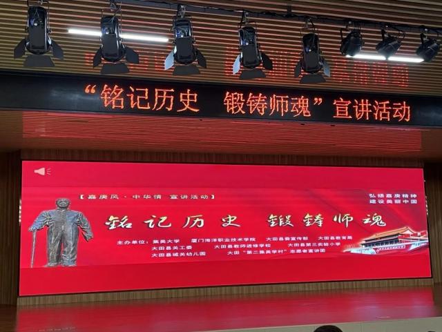 5月26日,球盟会与集美大学、大田县委宣传部、县教育局、县关工委、县教师进修公司、县第三实验小学、县城关幼儿园联办“铭记历史 锻铸师魂”宣讲活动。重温陈嘉庚先生的演讲《有枝才有花,有国才有家》,体会陈嘉庚在抗日烽火时的信念与情怀。