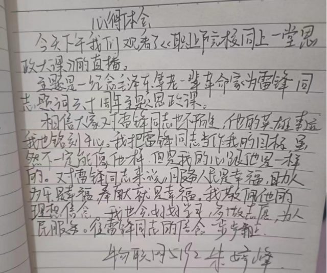 中共党史读书社物联网5192朱婷峰:今天下午我们观看了《职业院校同上一堂思政大课》的直播,纪念毛泽东等老一辈革命家为雷锋同志题词六十周年主题思政课。相信大家对雷锋同志也不陌生,他的英雄事迹我也铭刻于心。我把雷锋同志当作我的目标,我虽然不一定能像他一样,但是我的心跟雷锋同志是一样的,一心只为祖国。对雷锋同志来说,服务人民是幸福,助人为乐是幸福,奉献就是幸福。我很敬佩他的理想信念。我也会好好学习,多做志愿,为人民服务,加油!