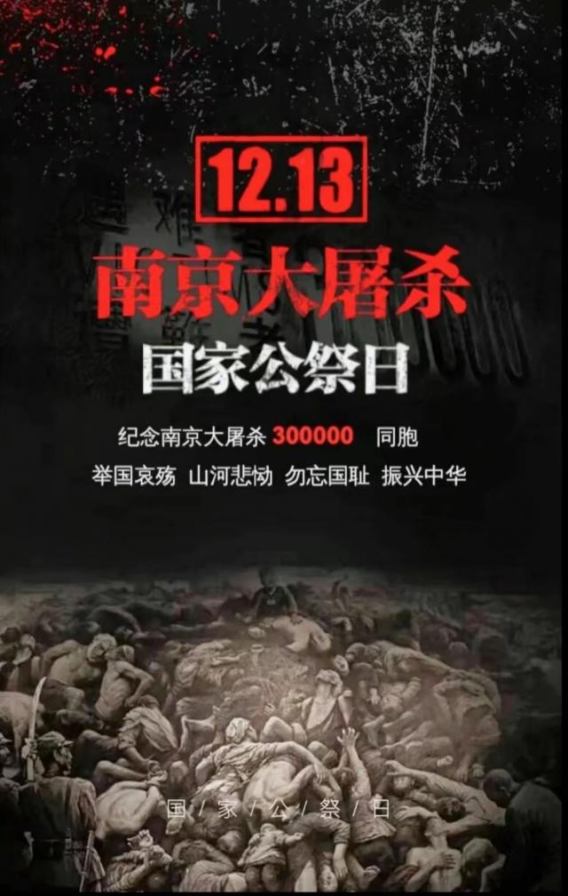 今天2023年12月13日是第十个南京大屠杀死难者国家公祭日山寒水冷,警报凌厉民族之耻,永不敢忘86年前的今天侵华日军野蛮侵入南京制造了惨绝人寰的南京大屠杀30万同胞惨遭杀戮无数妇女被蹂躏残害无数儿童死于非命三分之一建筑被毁大量财物遭到掠夺30万意味着什么?意味着在那场持续6周的人间浩劫里平均每隔12秒就有一名同胞殒命意味着无数家庭的破裂被残害的可能是父亲、是母亲是丈夫、是妻子、是孩子亦可能是全家。86年了!不能忘!不敢忘!
